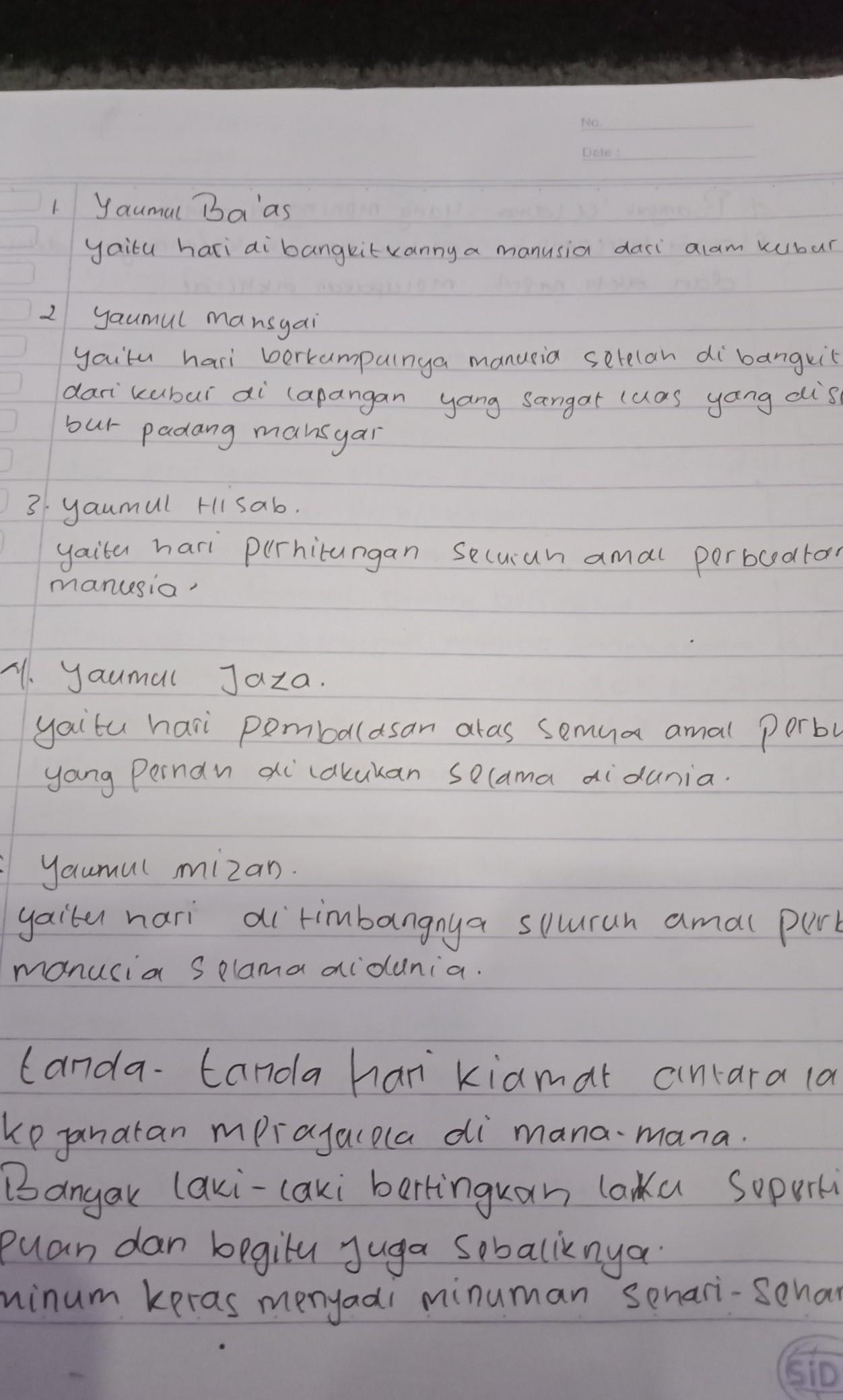 Yaumul ba'ats, yaumul hisab, yaumul hasyr, yaumul mizan dan yaumul jaza'. Setelah seluruh manusia sampai di padang . Yaumul hisab (hari perhitungan) adalah nama lain hari kiamat yang berarti hari perhitungan seluruh amal perbuatan manusia. يوم الميزان) adalah hari dimana umat manusia akan ditimbang amal perbuatannya setelah menjalani proses hisab untuk . Pada saat seperti itu seluruh manusia tidak akan bisa memungkiri tentang apa .